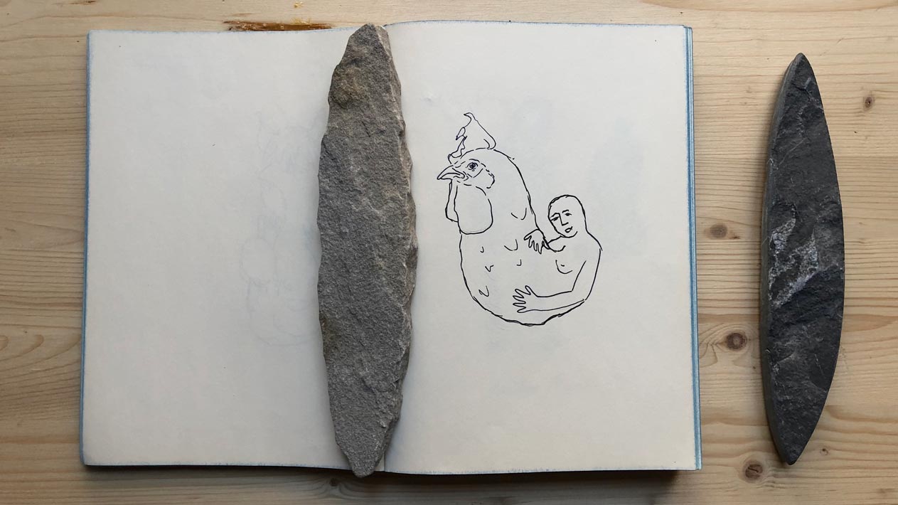 Al tuo passo consists of a series of small sculptures made of local stone that echo the elongated ogival shapes of the “coti” stones (used as abrasives to sharpen or grind tools), for ages a key product of the region’s economy. Scattered along the path like amulets in which the human and animal element unite and cohabit, the stones carved with words and drawings are a translation of the atmospheres and reflections gathered during the encounters with the inhabitants of Nembro. The sculptures can be read on the way up, in the proper direction, as a sort of walking and breathing score of one’s path; while on the way down they invite to pause briefly, to slow down in order to read them. An installation that indirectly recalls, through the time of any individual and community, that deep and layered time of each landscape.