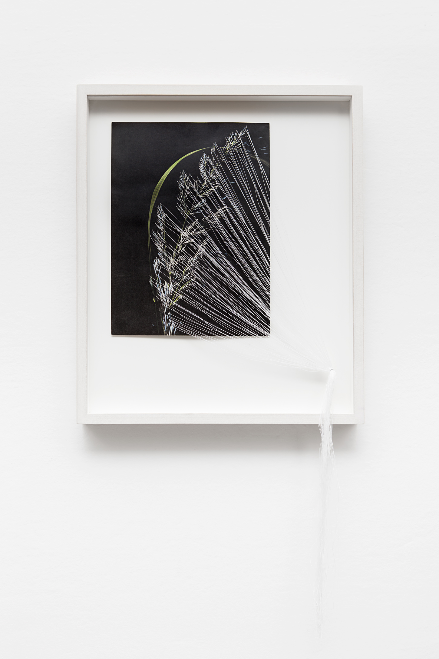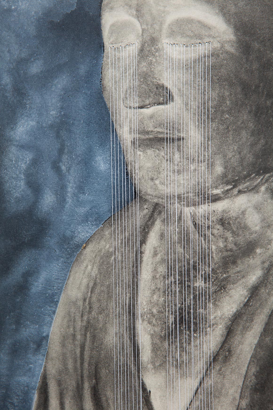 Old printed book’s pages, pencil, watercolor, cotton thread
